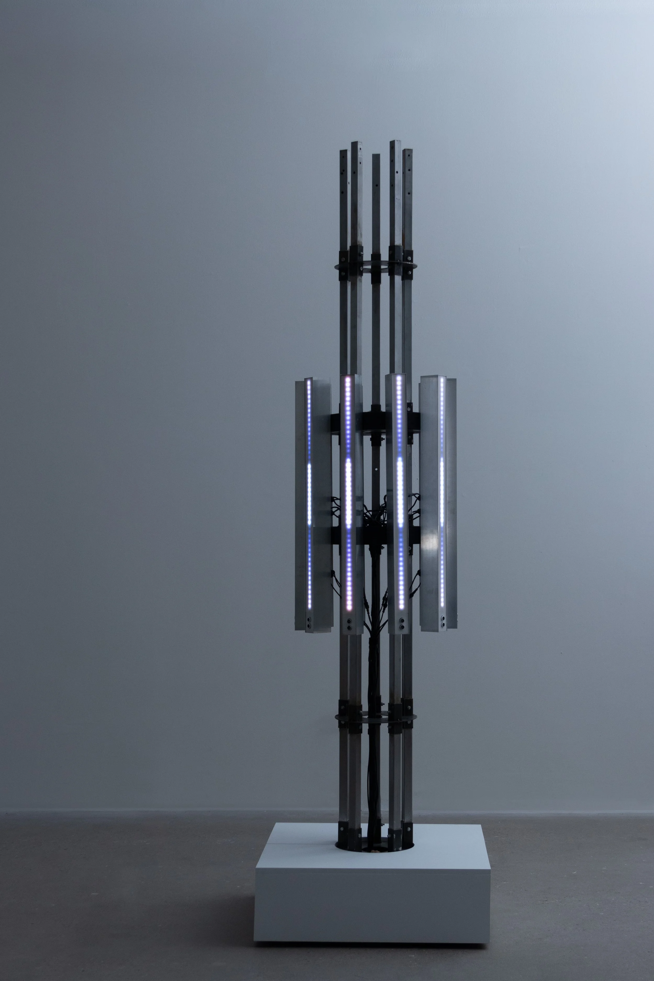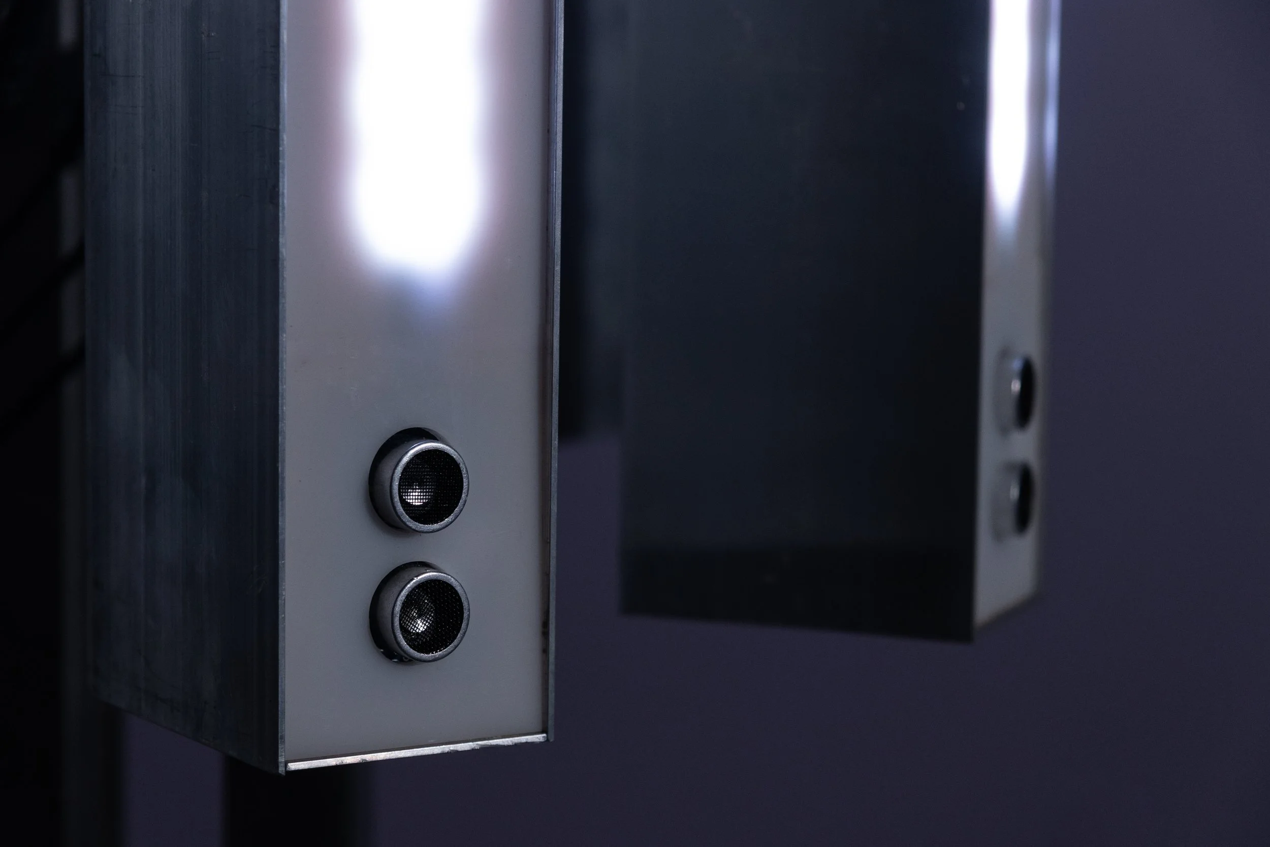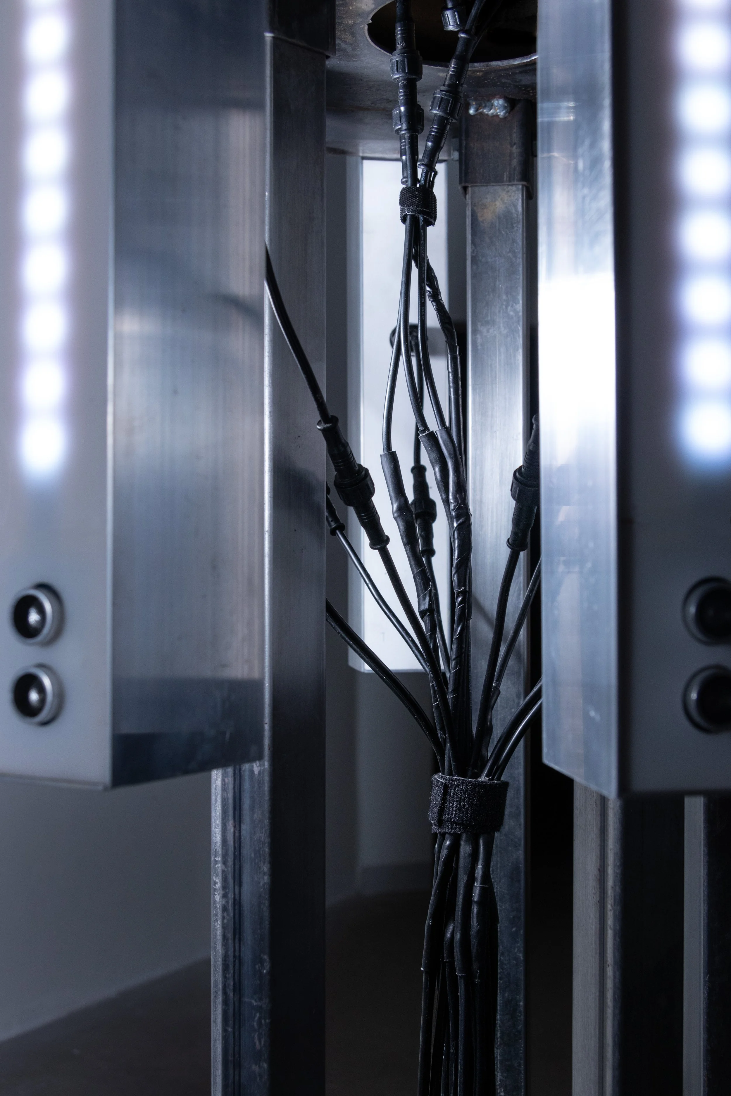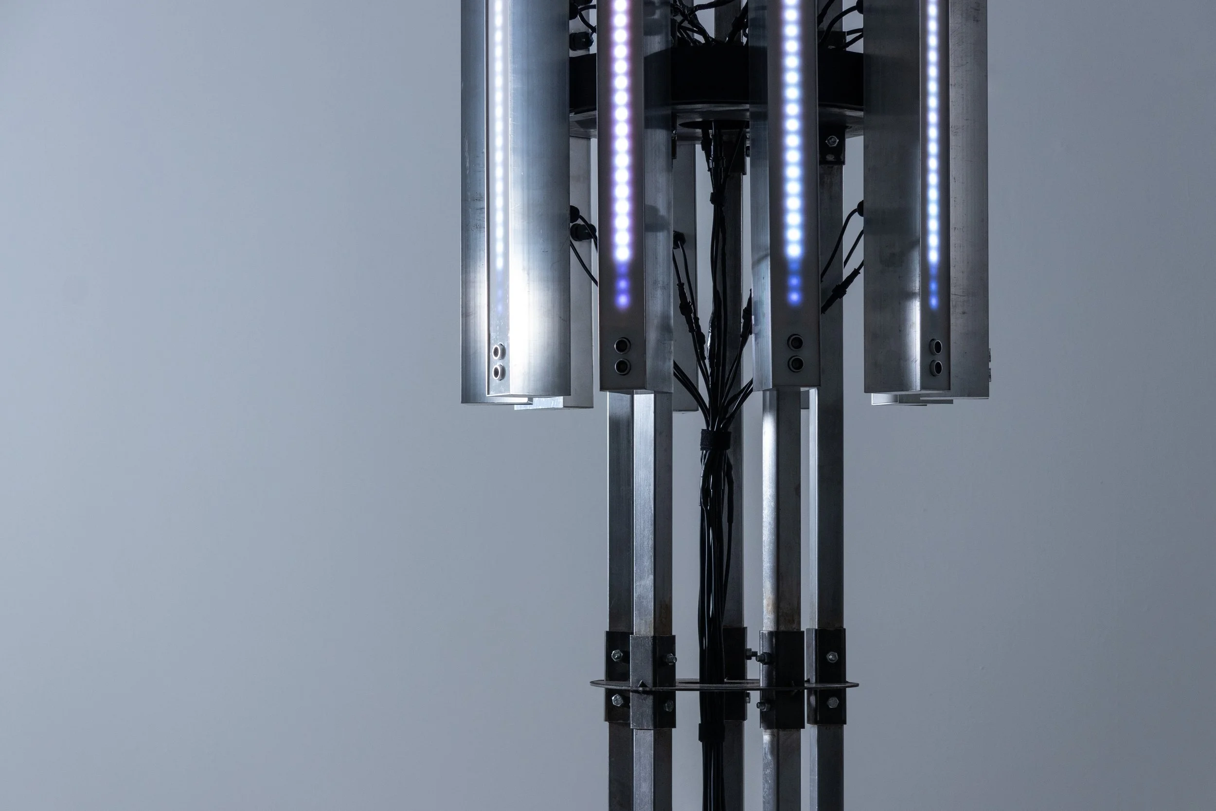 Group Theremin is a audio visual installation that uses ultrasonic sensors to generate synth like audio and LED animations. Referencing the form of a cell phone tower, the installation challenges the spatial relationship we have with these objects by allowing the viewer to interact with the invisible frequencies around us. This project layers light and audio to create a sensory interaction with the artwork, and your fellow viewers.
